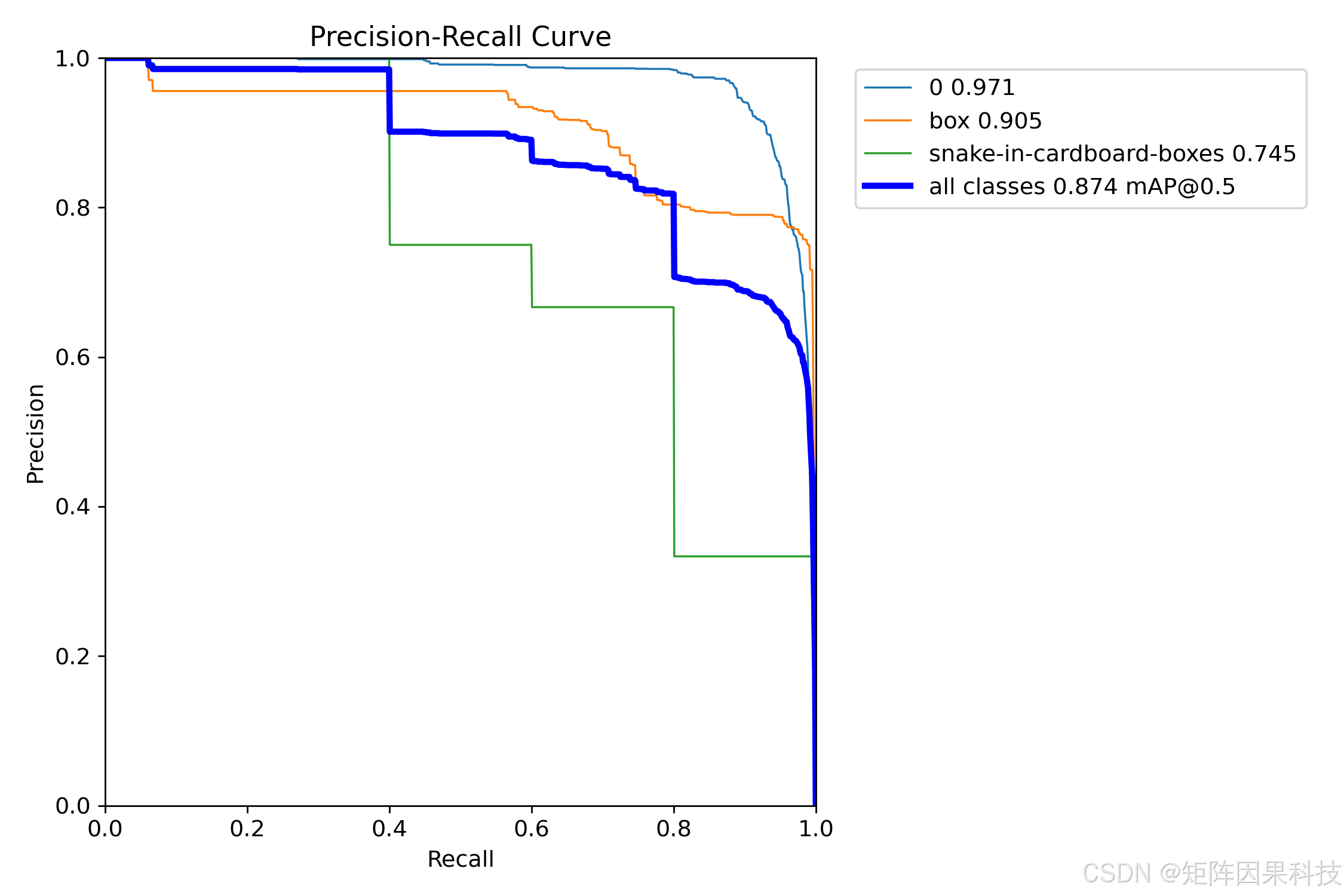 进一步从 PR 曲线观察类别差异,三类目标的 AP(IoU=0.5)分别为:包裹(Class 0)0.971 、纸箱(box)0.905 、塑料袋(snake-in-cardboard-boxes)0.745 ,全类 mAP@0.5 为 0.874 。如图所示,"塑料袋"类明显弱于"包裹/纸箱",这与其外观形变强、纹理弱、反光与褶皱导致边界不稳定有关,也与数据集中该类实例相对稀疏相吻合;相反,"包裹/纸箱"在尺度变化下仍维持较高的精度与召回,说明模型对规则几何边界与箱体纹理学习更充分。