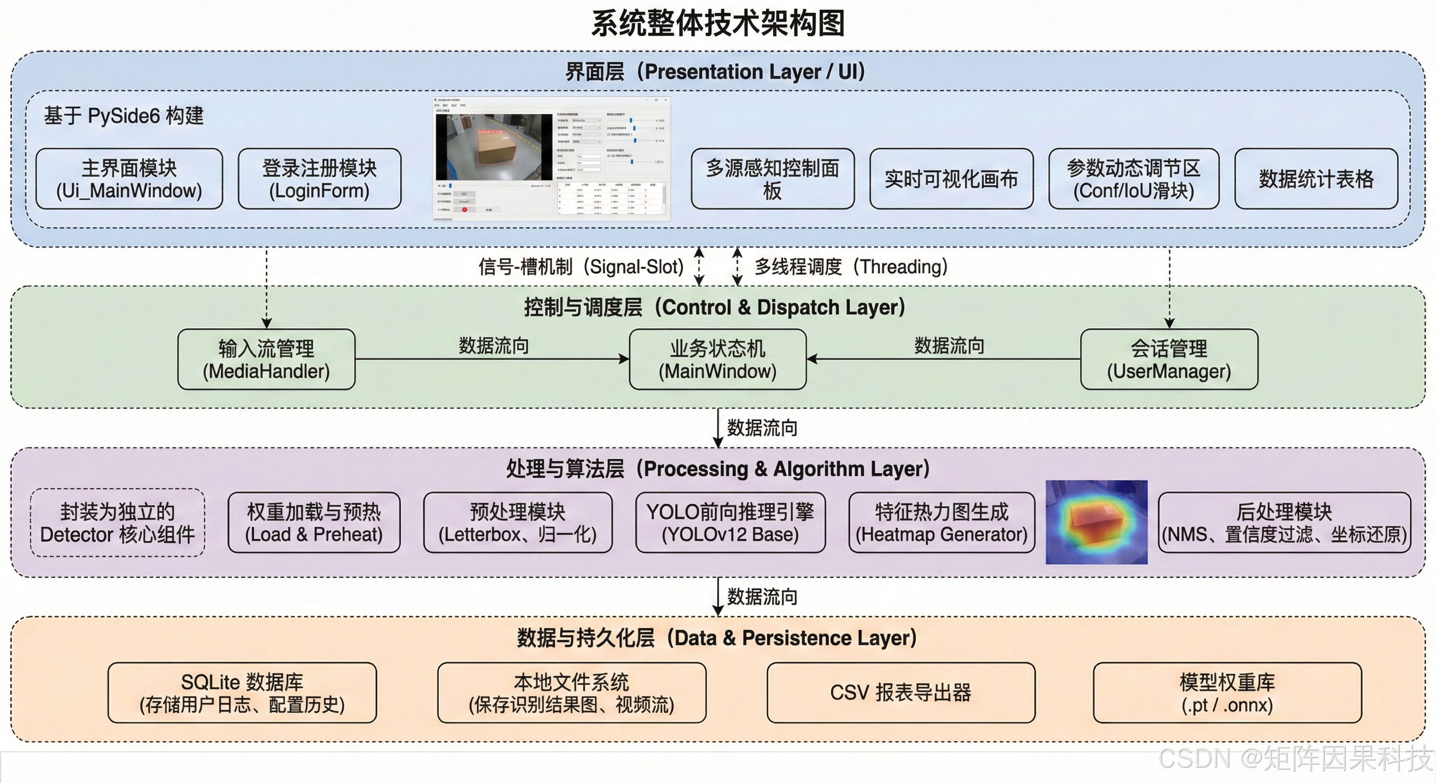 在并发与实时性方面,老思将推理过程从主线程中剥离,通过"信号---槽"机制实现跨层通信:控制层向处理层发送"新帧/新参数/切换模型"等请求,处理层在独立推理线程内完成 GPU 前向与后处理,并将渲染所需的绘制要素(框坐标、文本、颜色索引等)以信号形式回传给主线程,最终由界面层完成绘制与表格刷新。对视频/摄像头输入,系统在采集侧引入轻量队列缓冲,避免解码抖动将延迟传播到 UI;对模型切换,采用"加载---预热---替换引用"的方式完成平滑过渡,减少首次推理抖动对交互体验的影响。结果的持久化被设计为可选旁路:既支持导出可视化图片/视频,也支持写入 SQLite 以实现按用户隔离的历史追溯与统计分析,从而保证系统在"单机演示"和"现场长期运行"两类使用方式下都具备一致的数据闭环。