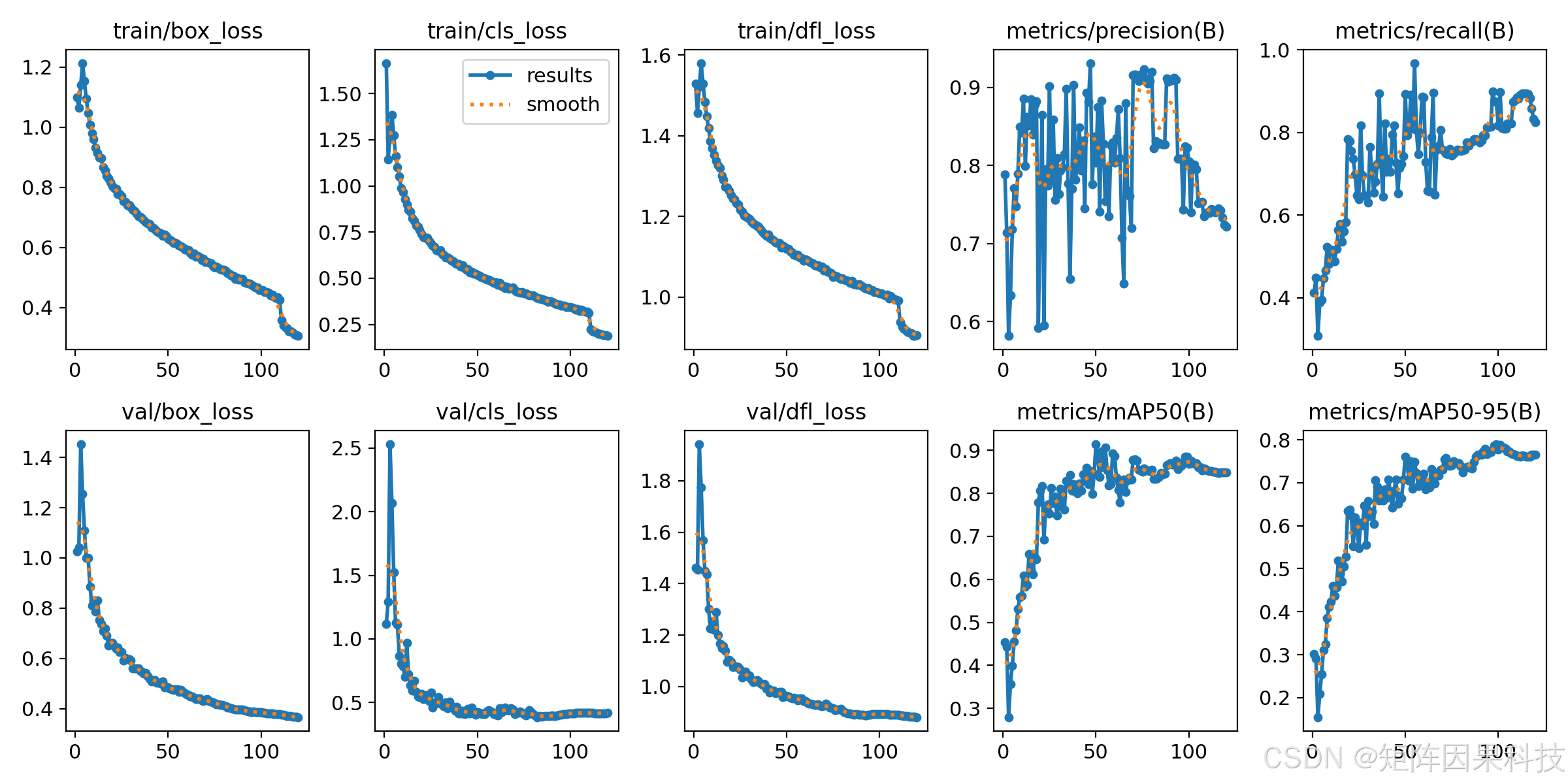以一次代表性训练日志(mAP50 约 0.87 的收敛水平)为例,训练/验证损失与精度指标曲线如图所示,box/cls/dfl 三项损失整体呈现稳定下降,mAP50 与 mAP50-95 在前 40 个 epoch 内快速提升,随后进入平台期并在后期小幅波动,说明训练已从"特征对齐"阶段进入"边界框细化与类别判别微调"阶段;同时 precision 曲线抖动大于 recall,体现该任务在强增强、复杂背景下更容易出现间歇性误检,阈值选择对最终可用性影响明显。