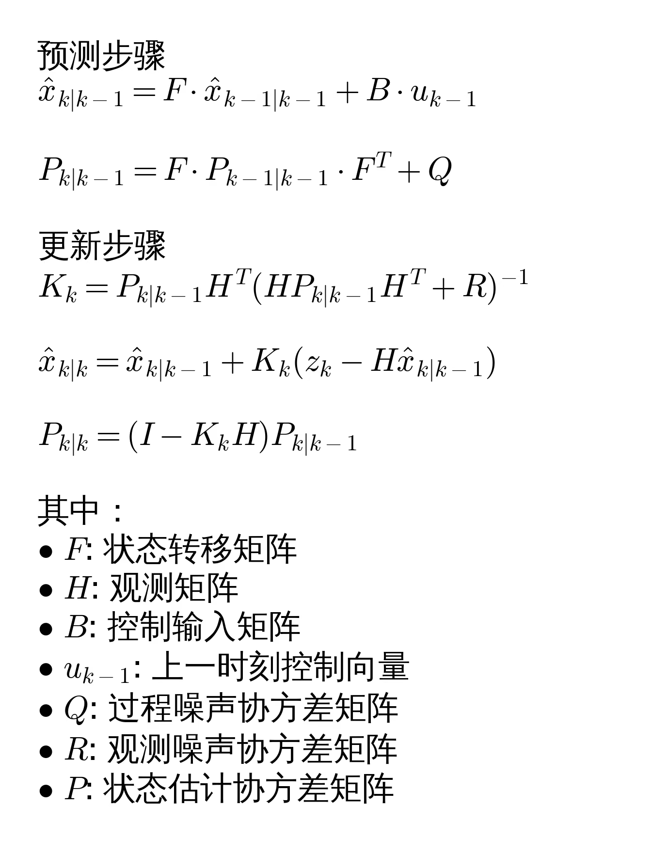 以上便是一维卡尔曼滤波在多维情形下的自然扩展。借助一维例子中的直观理解(预测与测量的加权融合),可以更好地把握多维滤波的核心思想。整个卡尔曼滤波过程,本质上就是不断重复"预测"与"更新"两个步骤的递推循环。