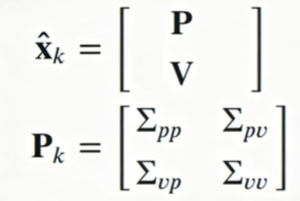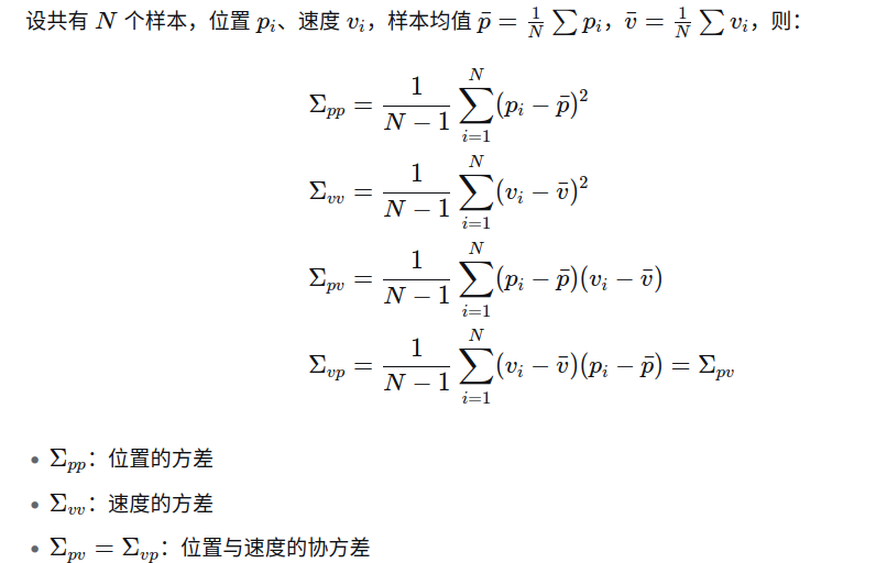 在卡尔曼滤波中,状态向量(如位置和速度)的协方差矩阵记为 P,它表示状态估计的不确定性及变量间耦合关系。