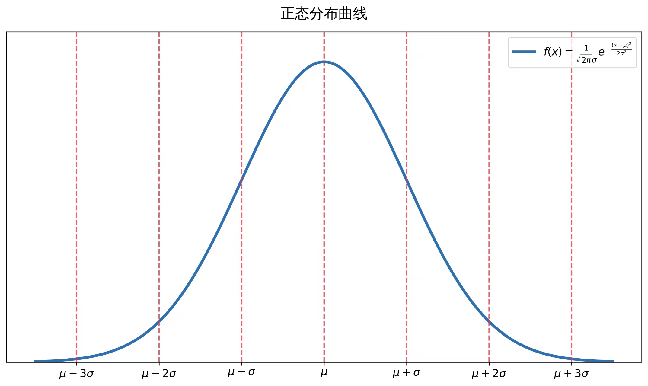 在实际生活中,绝大多数数据都服从(或近似服从)正态分布。正态分布曲线关于 x=μ(平均值)对称,曲线的"胖瘦"由标准差 σ(即方差的平方根)决定。数据落在 [μ−σ,μ+σ] 这个区间内的概率约为68%,落在区间外的概率约32%;而落在更宽的区间(如 [μ−2σ,μ+2σ]])内的概率则更高(约95%)。总之,数据落在平均值附近区间内的概率,明显大于落在远离平均值的区间外的概率。