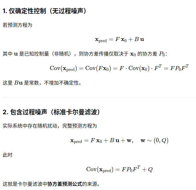 然而,上述推导隐含了一个假设:小车的运动完全精确地遵循"1 m/s 的匀速模型"。实际上,路面摩擦、微小加减速、风阻等随机扰动会使真实速度发生波动,导致模型预测值与真实轨迹之间出现额外的偏差。这种未建模的随机加速度 称为过程噪声 。为了反映这种不确定性,我们需要在每一步预测中增加一个过程噪声方差 Q。于是,预测方差不再保持固定值,而是更新为: