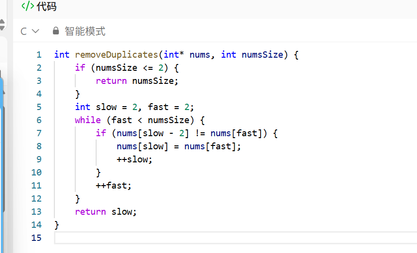 slow初始化为 1。但这道题允许保留两次,前两个元素天然有效,所以slow应该从索引 2 开始,直接从第三个元素开始判断是否需要替换。 - 判断条件的误区 很容易错误地用