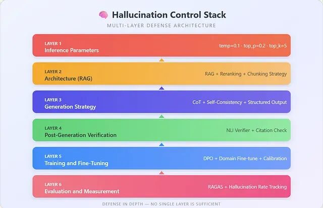 这就是我们所说的幻觉,它是一个跨层级的问题:推理参数、系统架构、生成策略、生成后验证、模型训练、持续评估,每一层都有份,所以不能把它当成单点问题来处理。
