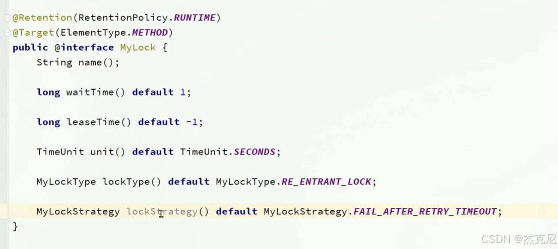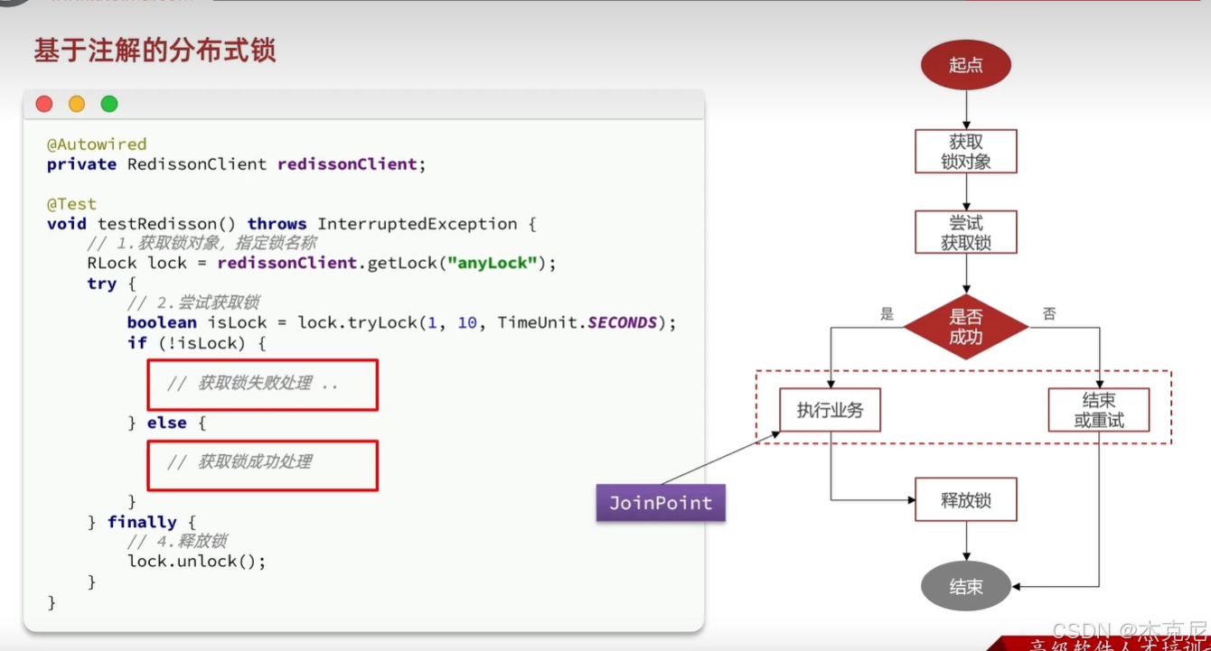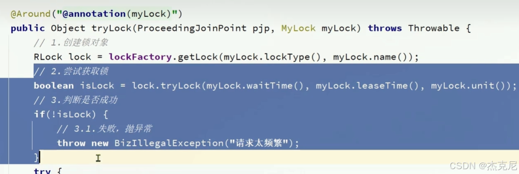 不过Redisson分布式锁的加锁和释放锁逻辑对业务侵入比较多,因此我 就对其做了二次封装(强调是自己做的),利用自定义注解 ,AOP ,以及SPEL表达式实现了基于注解的分布式锁。(面试官可能会问SPEL用来做什么,没问的话就自己说)