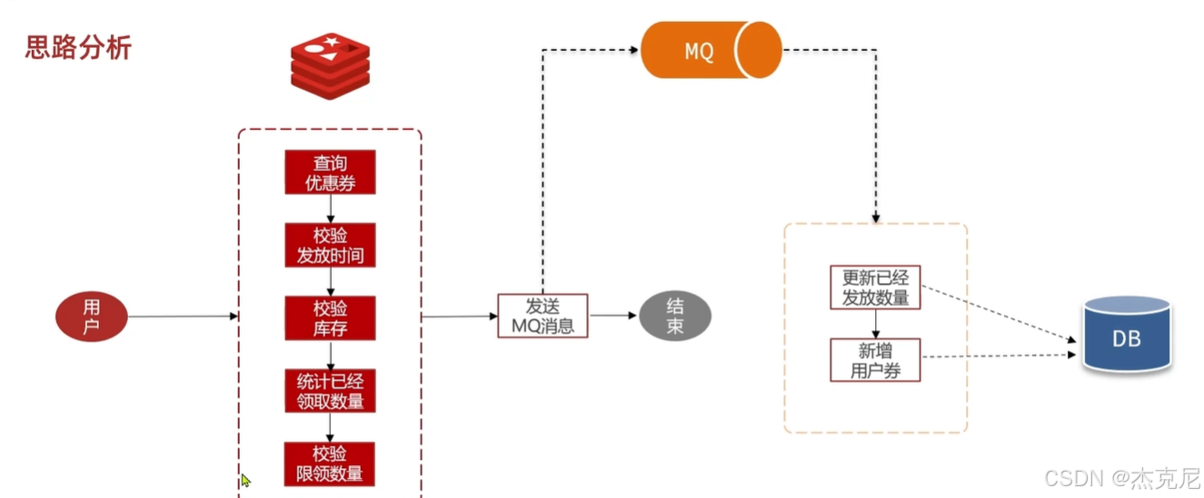 具体来说,我们可以将优惠券的关键信息缓存到Redis中,用户请求进入后先读取Redis缓存,做好优惠券库存、领取数量的校验,如果校验不通过直接返回失败结果。如果校验通过则通过MQ发送消息,异步去写数据库,然后告诉用户领取成功即可。