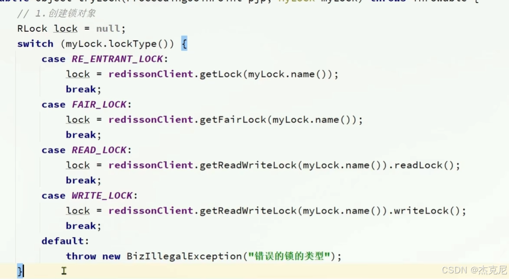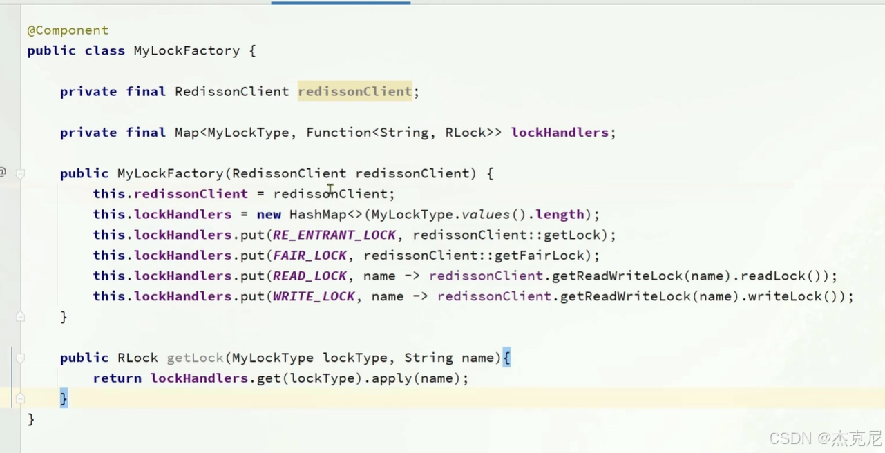 MyLockFactory内部持有了一个Map,key是锁类型枚举,值是创建锁对象的Function。注意这里不是存锁对象,因为锁对象必须是多例的,不同业务用不同锁对象;同一个业务用相同锁对象。