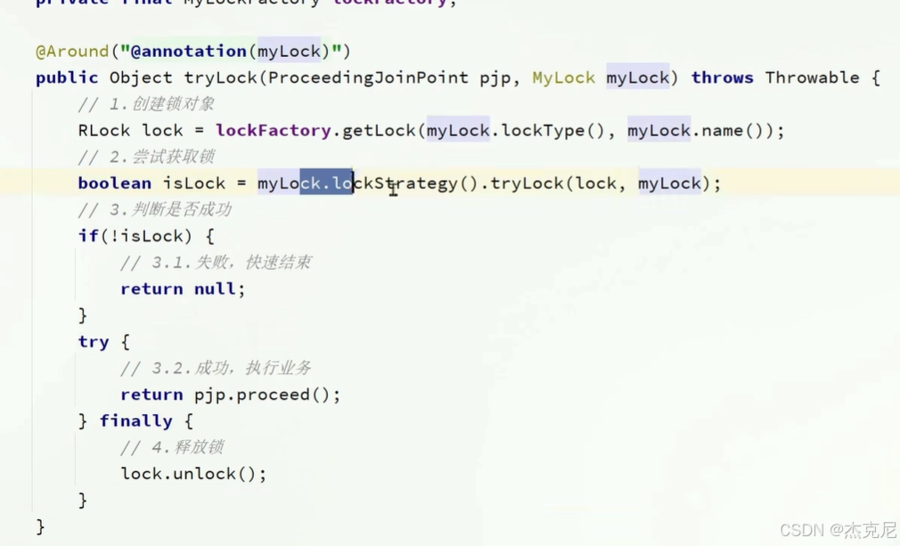 我在封装的时候用了工厂模式来选择不同的锁类型,利用了策略模式来选择锁失败重试策略,利用SPEL表达式来实现动态锁名称。