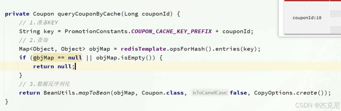 这段代码是优惠券Redis Hash 缓存查询逻辑:拼接唯一缓存 Key,查询 Hash 全字段数据,缓存不存在直接返回 null,存在则将 Hash 键值对转换为优惠券 Java 实体返回。