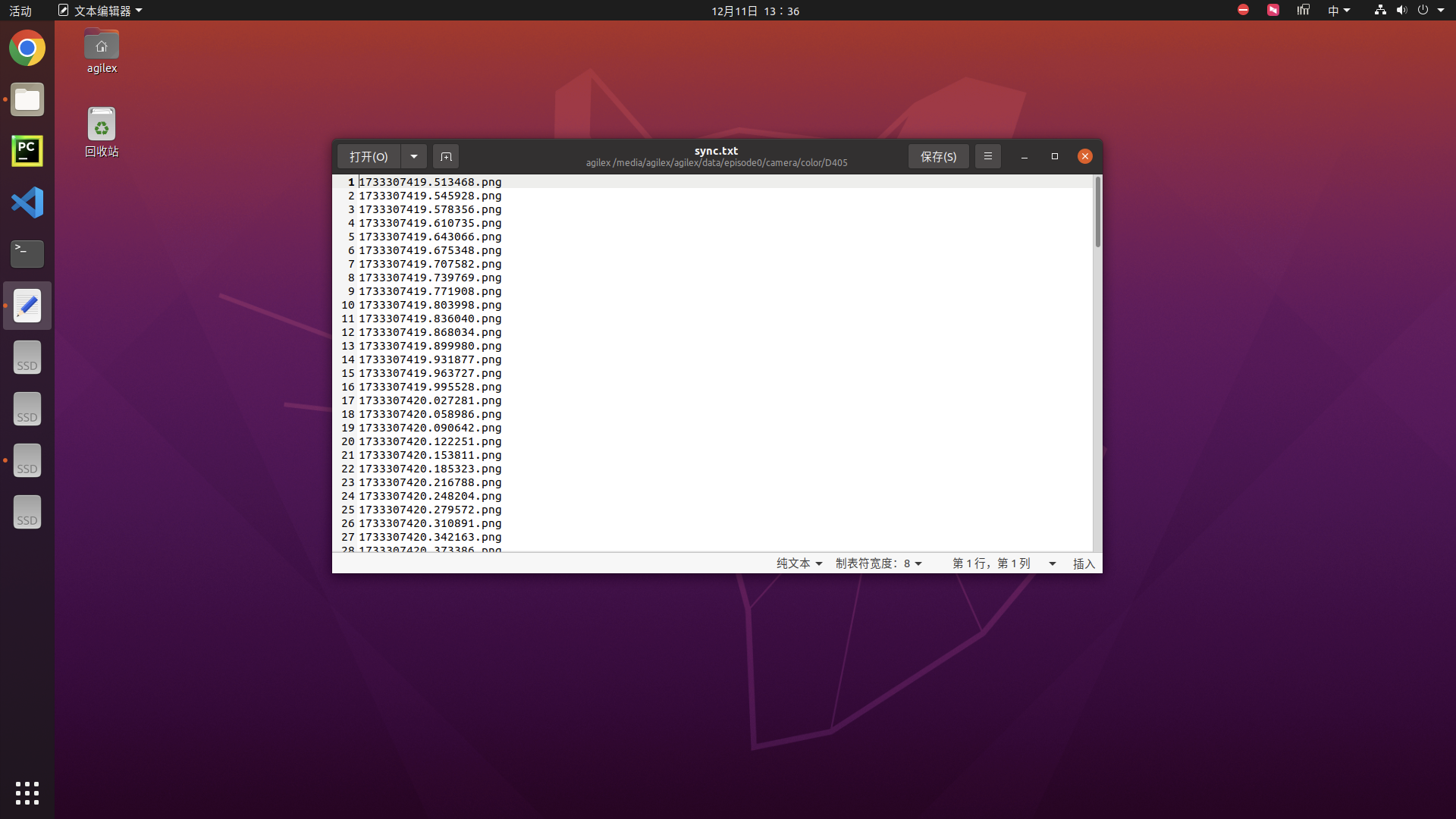同步完成之后,将在每个特定数据路径中生成一个sync.txt文件。例如,图像数据同步索引文件路径:/home/agilex/data/episode0/camera/color/pikaDepthCamera/sync.txt