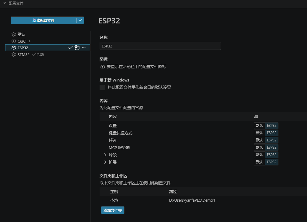 根椐需要建不同的配置文件,我建了c&c++,ESP32,STM32三个配置文件,然后在不同的配置文件下