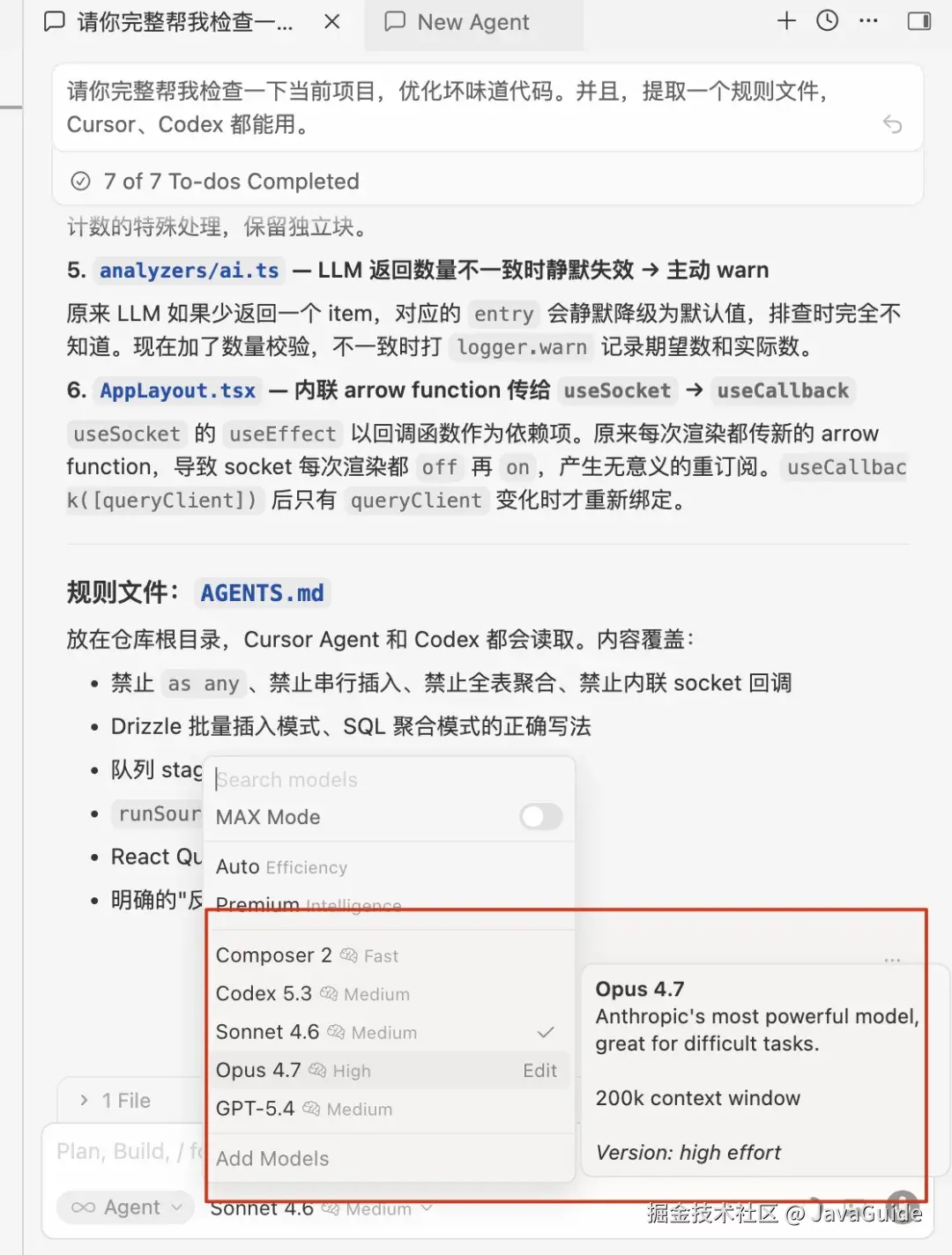 Cursor 不一样。它的 Agent 模式是直接"替你干活":你用自然语言描述需求,它能读懂整个项目的上下文,跨多个文件进行修改,自动跑测试,甚至能自动处理报错。这种体验在当时带来的冲击是实实在在的------至少对 Guide 来说是这样。