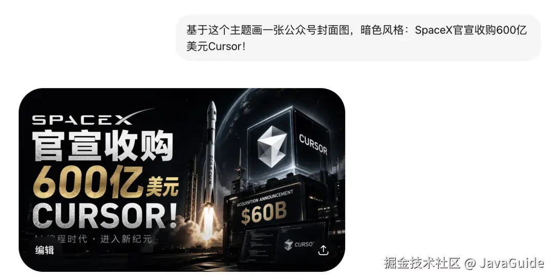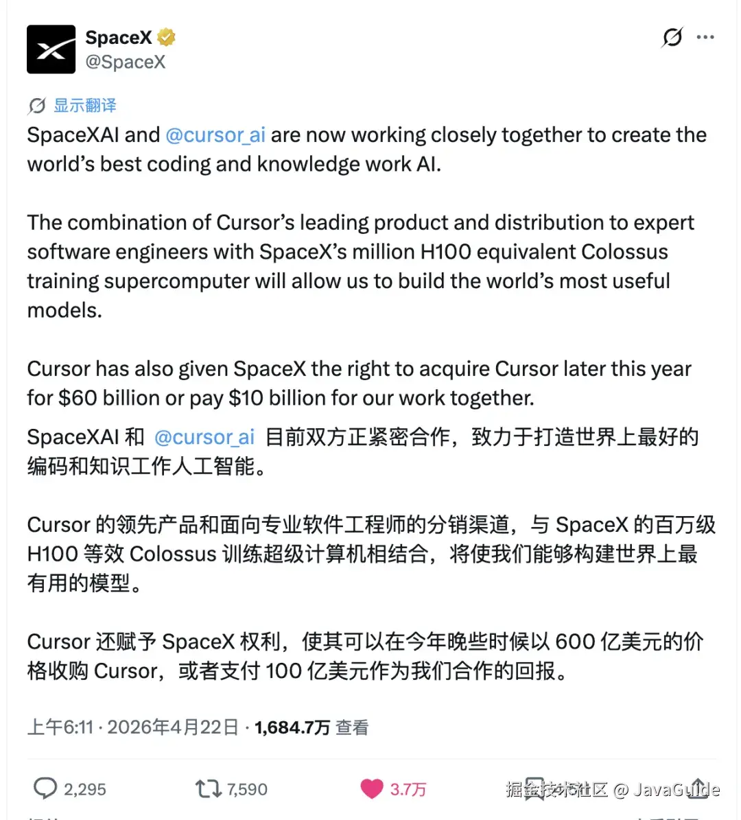 你好,我是 Guide。昨天刷到一条消息的时候,我愣了几秒:SpaceX 宣布拿下了收购 Cursor 的期权,行权价 600 亿美元。如果最终不买,违约金 100 亿。