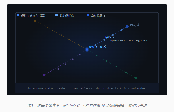 dir = normalize(uv − center)``sampleUVi = uv + dir × strength × (i / numSamples)``color = Σ tex2D(sampleUVi) / numSamples