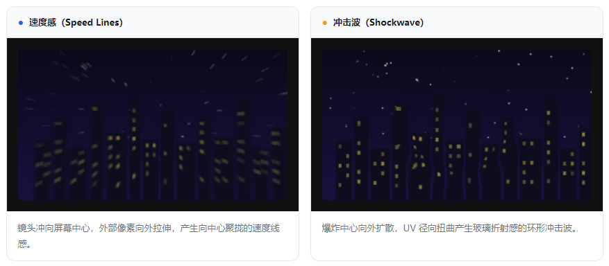**径向模糊(Radial Blur)**是一种以屏幕(或世界空间某点)为中心, 沿"中心→当前像素"方向做多步偏移采样并加权混合的后处理技术。 它能制造出镜头快速推进、子弹时间、冲击波爆炸等极具视觉冲击力的效果。