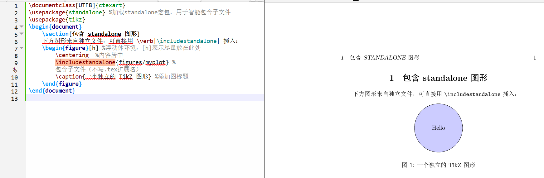 ①在子文件中,作为文档类:你把一张图或一个章节的代码放在一个 .tex 文件中,并将文档类设为 standalone。这样,这个子文件就能独立编译,方便反复修改和预览,同时不会影响主文档的编译效率