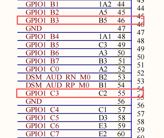 从硬件原理图可知,连接器46、55引脚号对应开发板功能GPIO1_B3、GPIO1_C3。