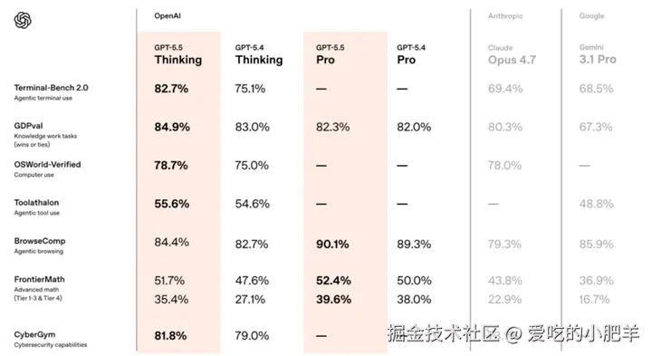 对标Claude和Gemini,全面领先。OpenAI这次把GPT-5.5和Claude Opus 4.7、Gemini 3.1 Pro放在一起跑了一圈基准测试,结果是几乎全线领先。