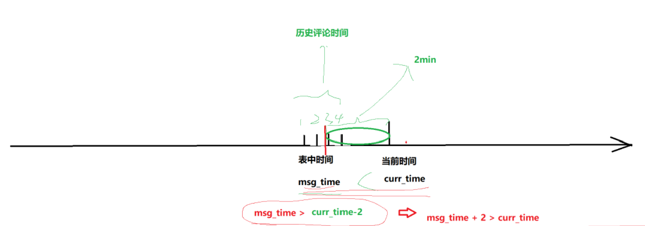 表中的时间记录的是之前发布帖子的时间,当前时间一定大于表中的时间,所以如果msg_time(表中的时间) > curr_time(当前时间) -2,证明一定在2min内