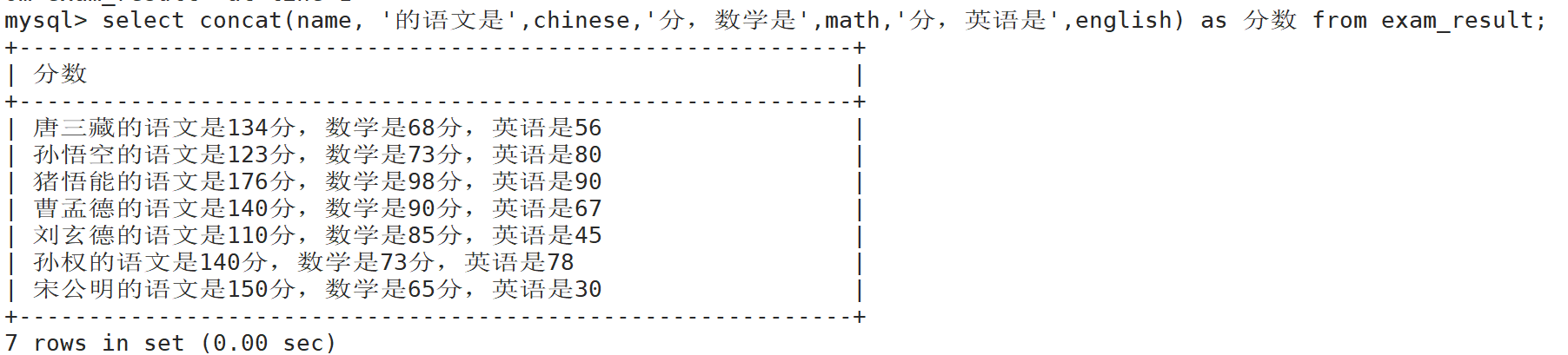 要求显示exam_result表中的信息,显示格式:"XXX的语文是XXX分,数学XXX分,英语XXX分"