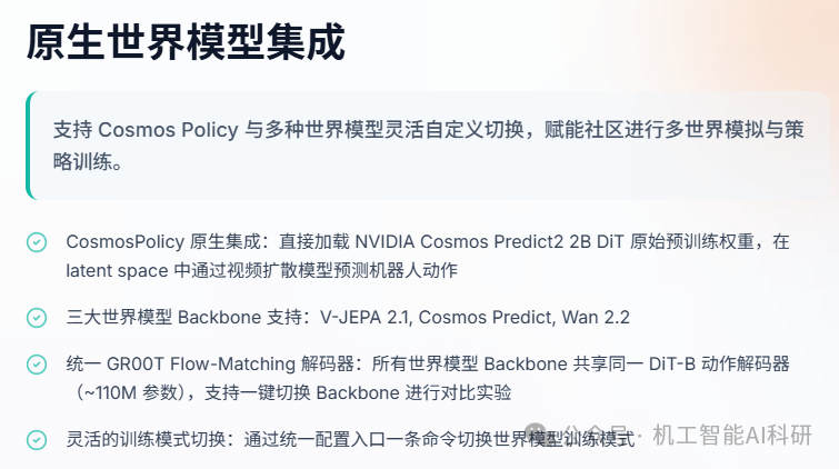 支持开发者在 Meta V-JEPA、英伟达 Cosmos Predict、阿里 Wan 等顶尖世界模型之间灵活切换。