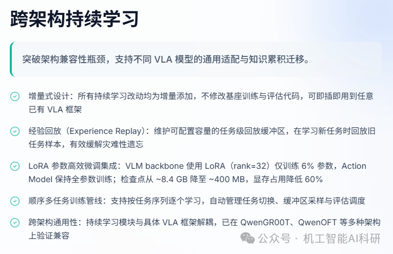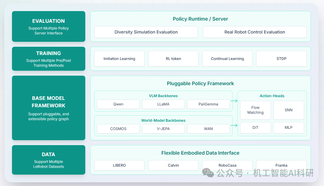 - 兼容性: 采用增量式设计,支持 QwenGR00T、LLamaOFT 等多种主流架构。