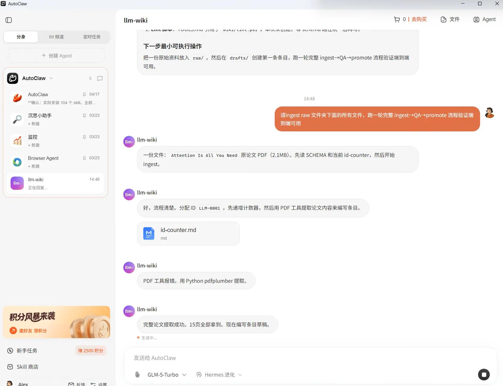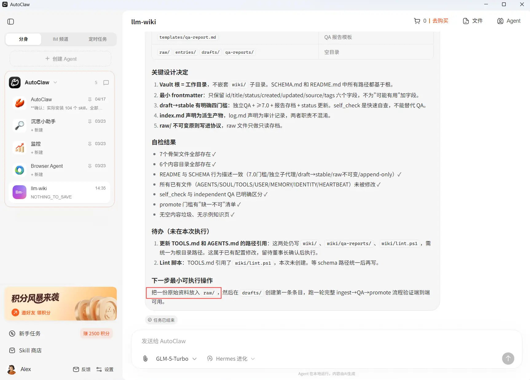 第四步,把初始化llm-wiki的提示词:llm_wiki_from_scratch.md 发给 AutoClaw