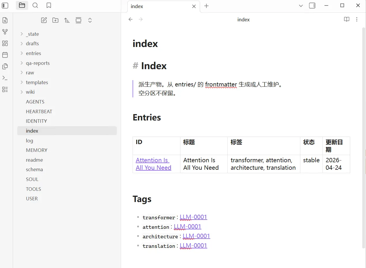 index.md、log.md和_state/id-counter.md。 - 最后自检 Markdown、同步索引、记录审计,并在没有独立审阅时留下