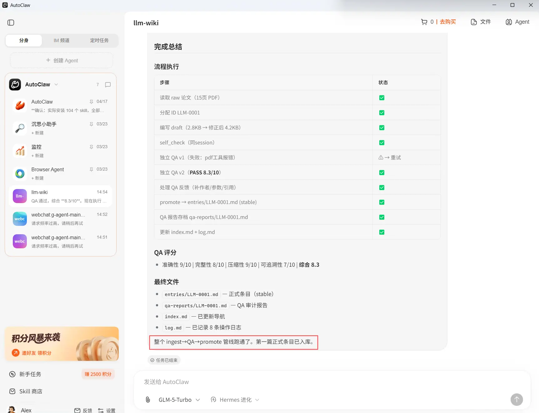 重点检查 index.md、log.md、qa-reports/ 有没有同步更新,stable 有没有被过早使用,并查看AutoClaw的子代理的QA报告,若一切正常,说明:ingest→QA→promote 流程验证端到端可用。