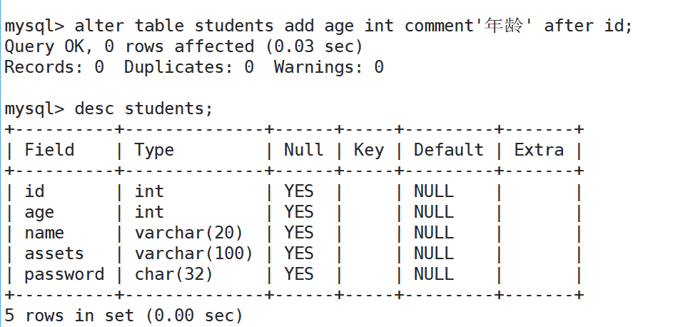 after table students add age int comment'年龄' after id;//向表结构里插入字段
