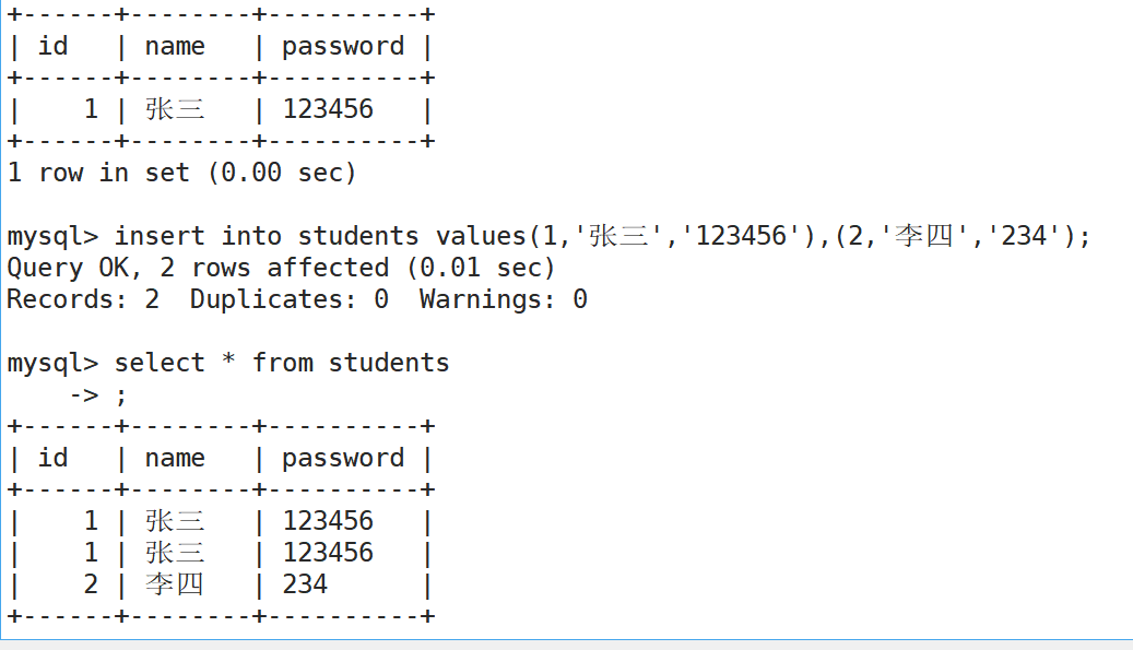 insert into students values(1,'张三','123456') //向表中插入数据