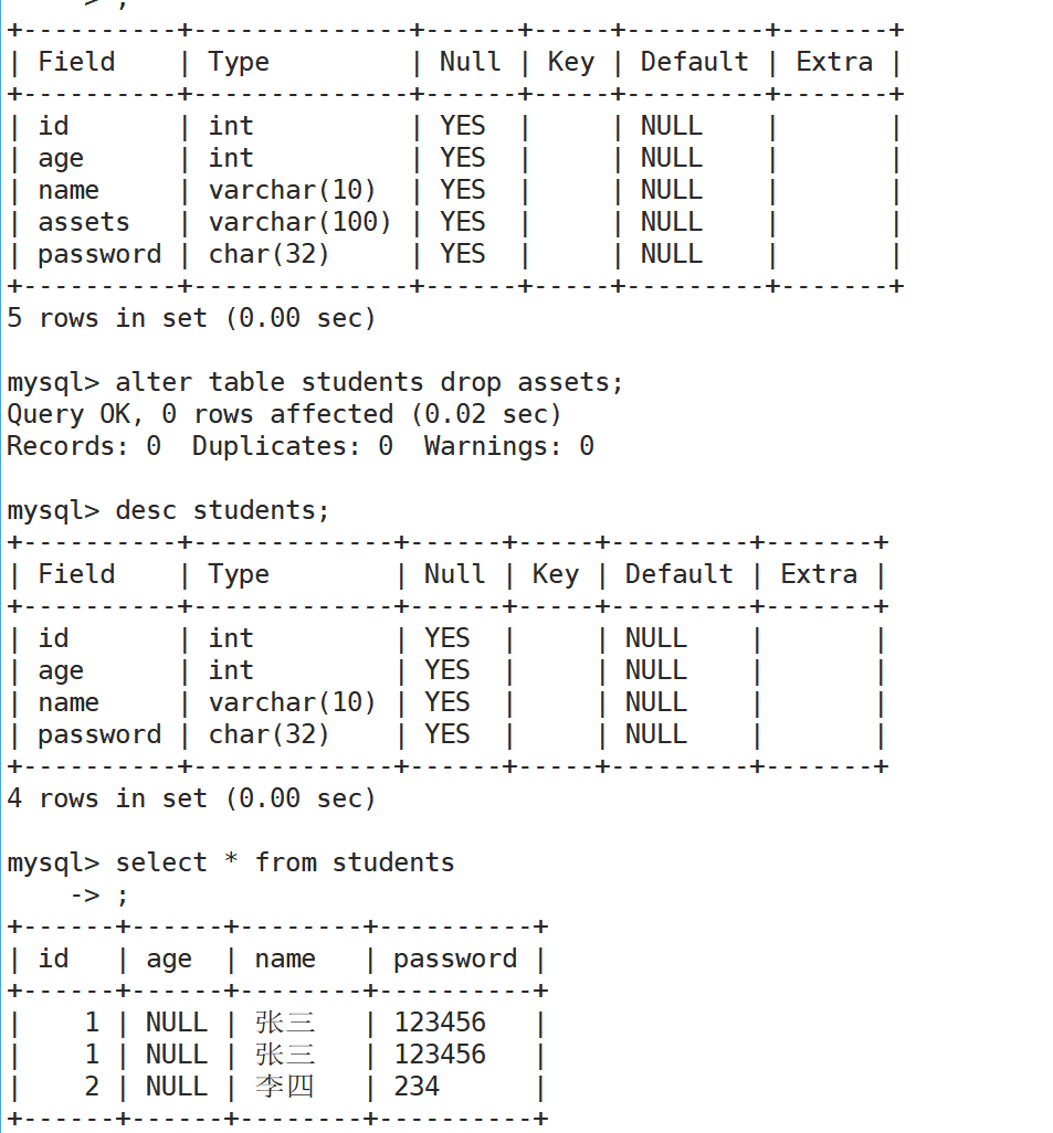 alter table students drop assets;//删除字段及其对应的列数据都没了