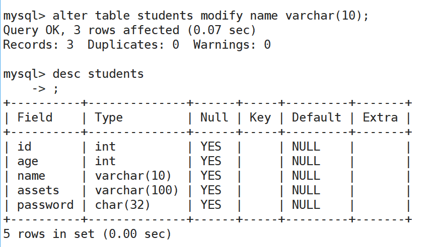 alter table students modify name varchar(10);