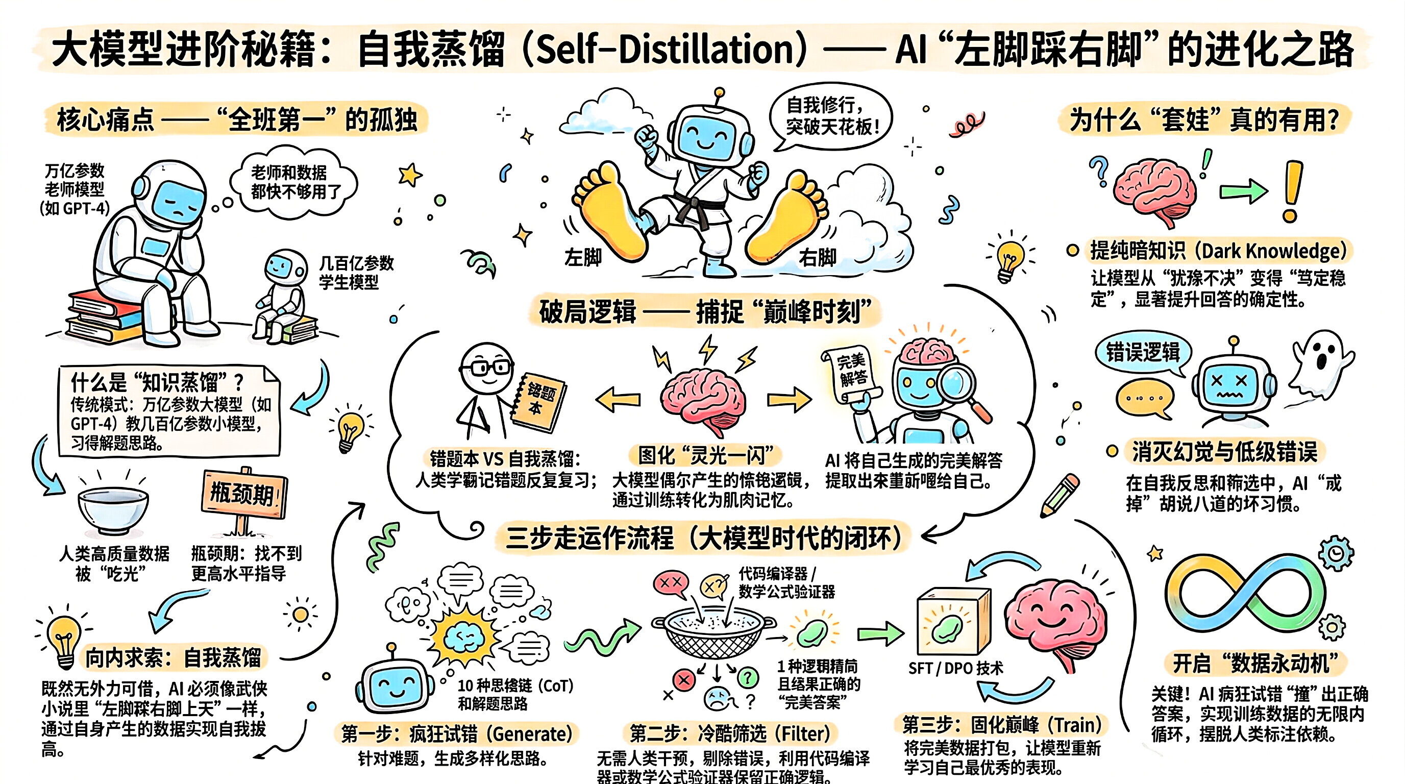 Self-Distillation (自我蒸馏) 是 AI 训练领域里一门非常神奇的武功,用一句最通俗的中国互联网黑话来解释,它就像是武侠小说里的**"左脚踩右脚上天"** 。