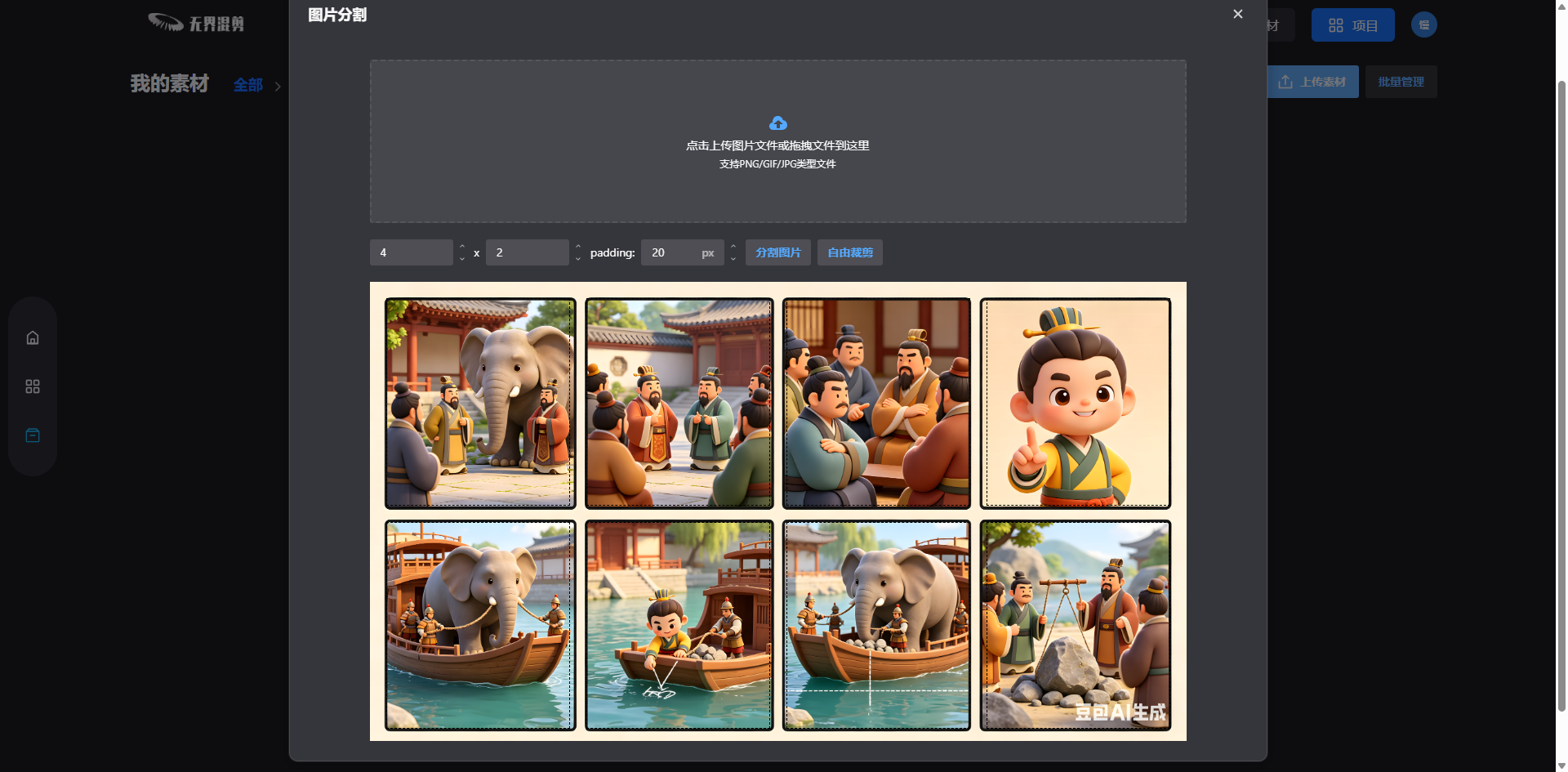 4. 进入到我们的无界混剪工具中,使用右上角的图片分割工具将图片分割成多张图片