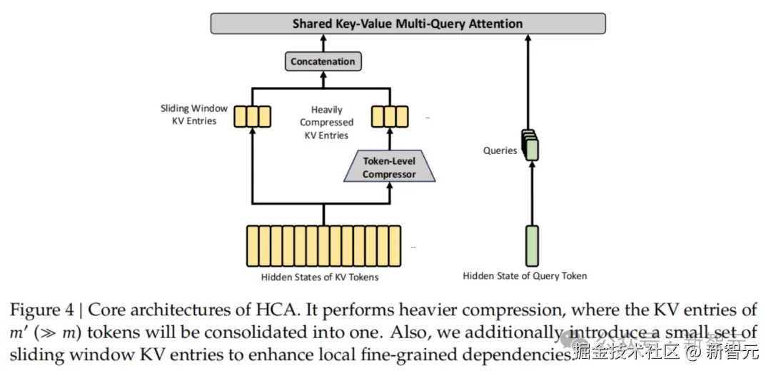 HCA 走另一条路。压缩率拉到 128,比 CSA 激进得多,但不做稀疏选择,所有压缩后的 KV 条目都参与计算。极致压缩换全局视野。
