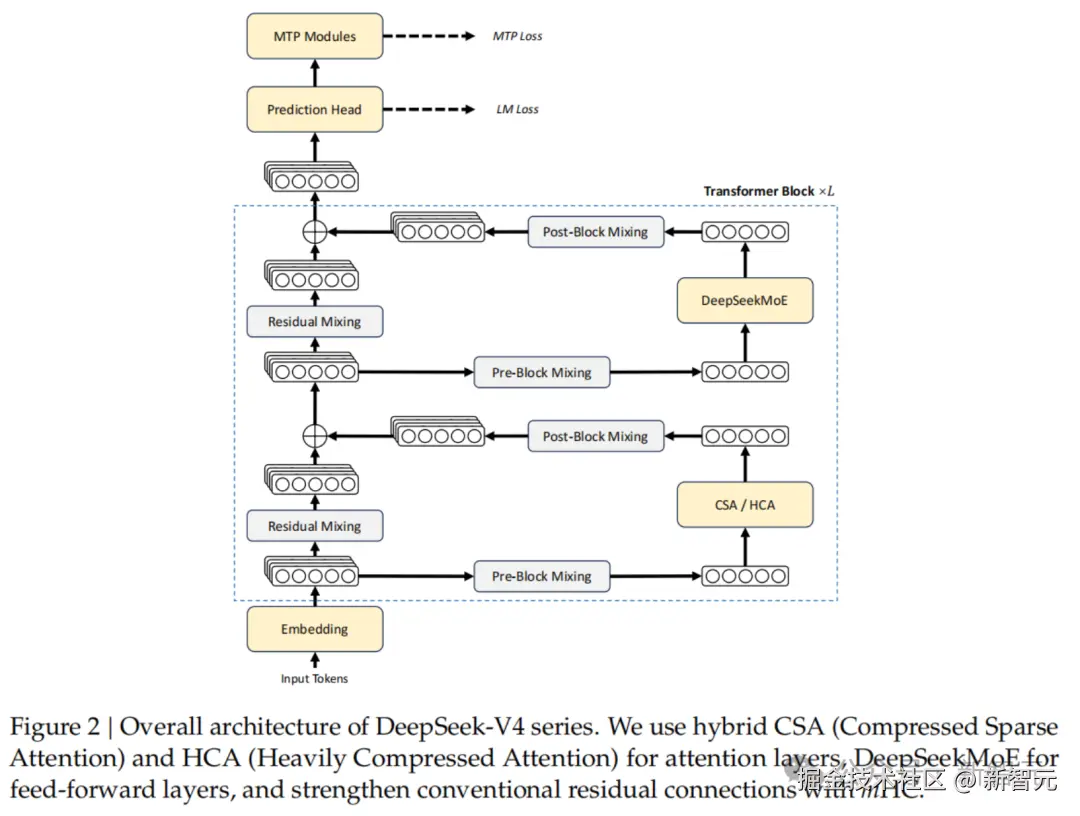 为了提升信号传播的稳定性并增强模型表达力,V4 引入了 mHC 结构,升级了传统的残差连接。这让模型在深层网络中依然能保持卓越的建模能力。