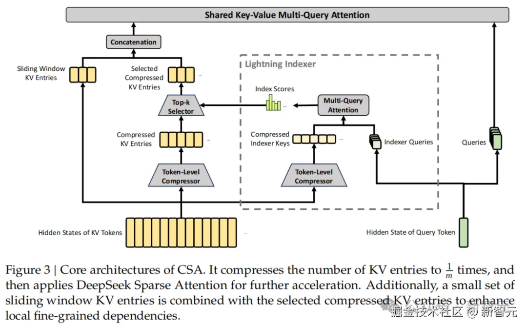 V4-Pro 中,CSA 的压缩率为 4,每 4 个 token 的 KV 缓存合并成一个条目。