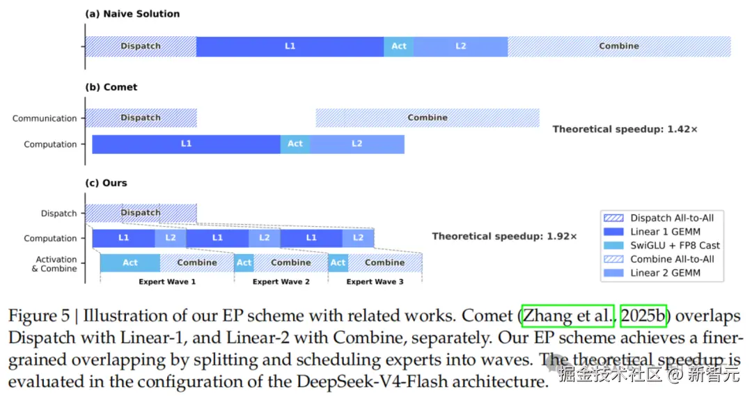 MoE 工程上,V4 开源了 MegaMoE,把通信和计算融合进单个 pipeline kernel,通用场景加速 1.5 到 1.73 倍,延迟敏感场景最高 1.96 倍。