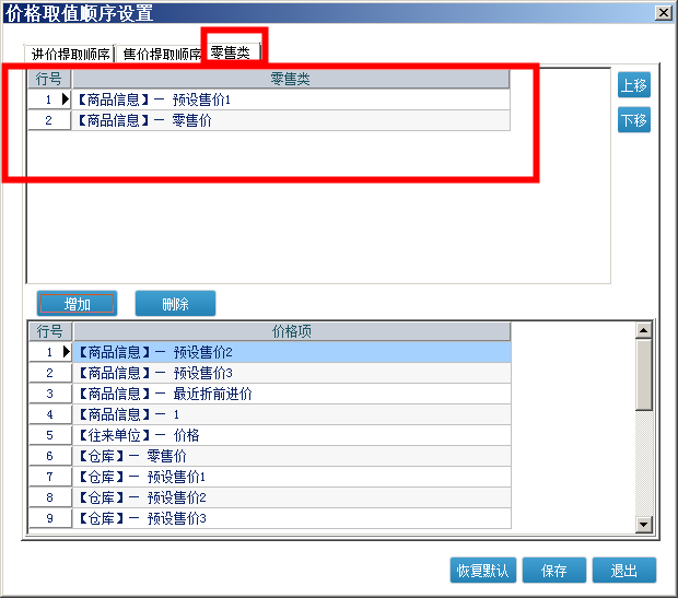 3,系统维护-价格体系-价格读取顺序里查看,如果更改过零售类的价格的读取顺序,那么零售POS售价会默认读取最上面的价格,而不是读取商品信息里录入的零售价,这就会导致零售价和售价有差异存在。
