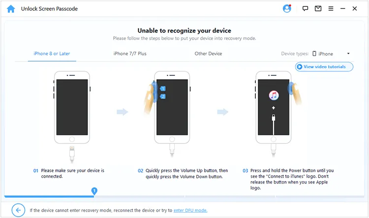点击"开始",然后用 USB 数据线将 iPhone 连接到电脑。接着选择您的设备型号,并按照屏幕上的指南将 iPhone 进入恢复模式。