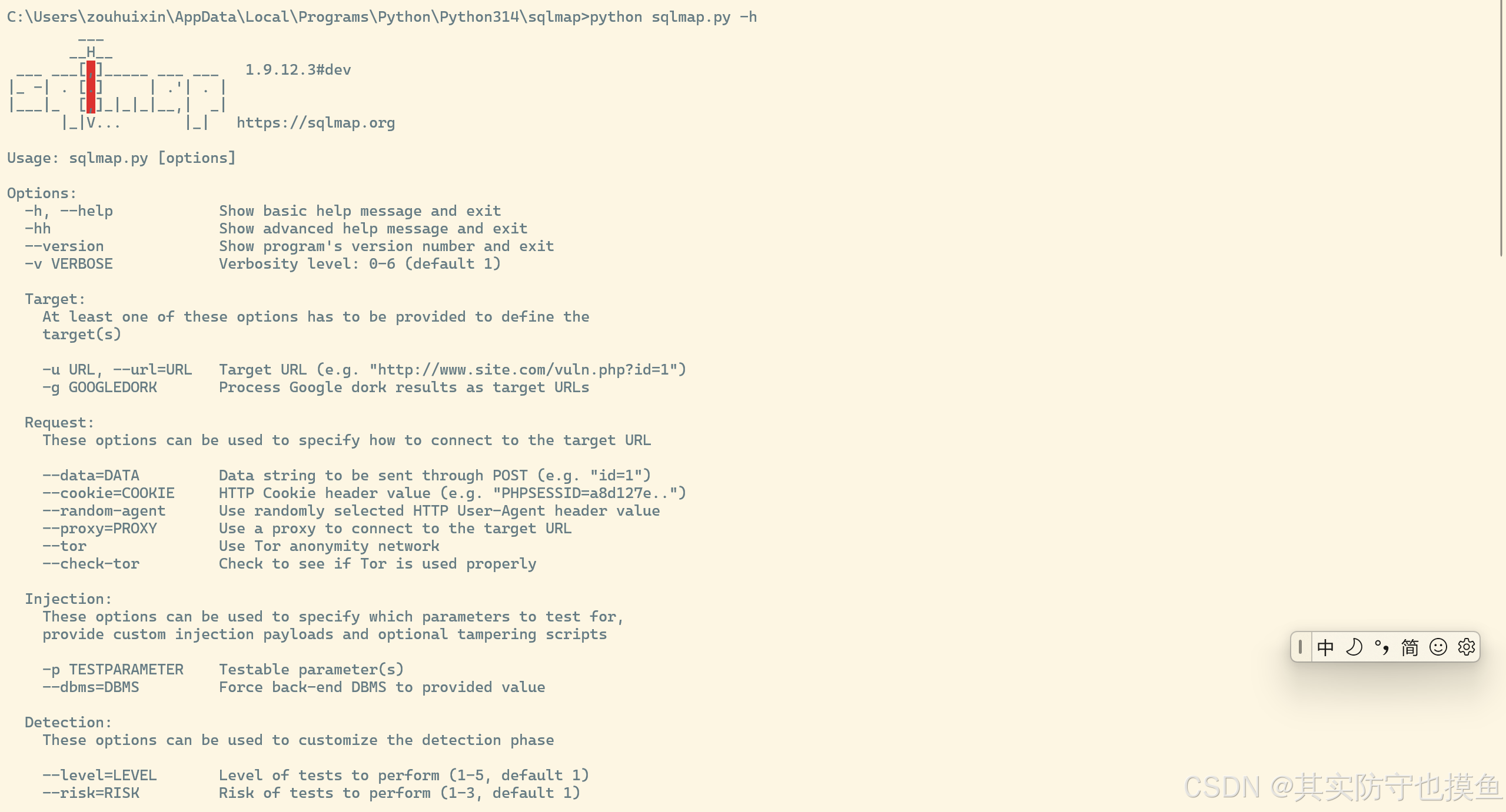 2.输入命令 python sqlmap.py 或 python sqlmap.py -h ,显示下图所示界面,安装成功