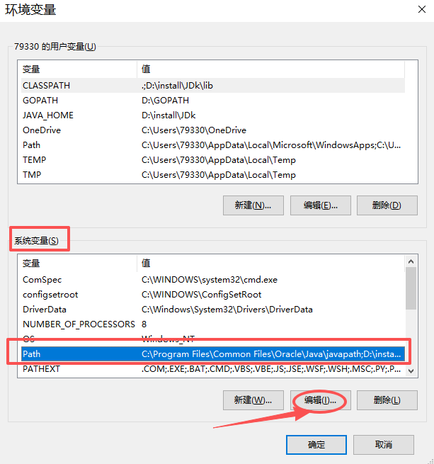 - 在 "系统变量" 中选择 "Path",点击"编辑":