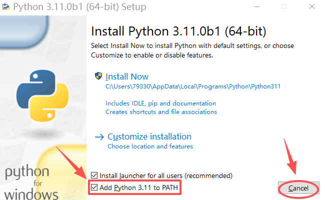 - 下载解压 sqlmap 文件,双击 python-3.11.0b1-amd64.exe 启动安装,出现下图所示界面,勾选 "Add_Python 3.11 to PATH",点击 "Cancel":