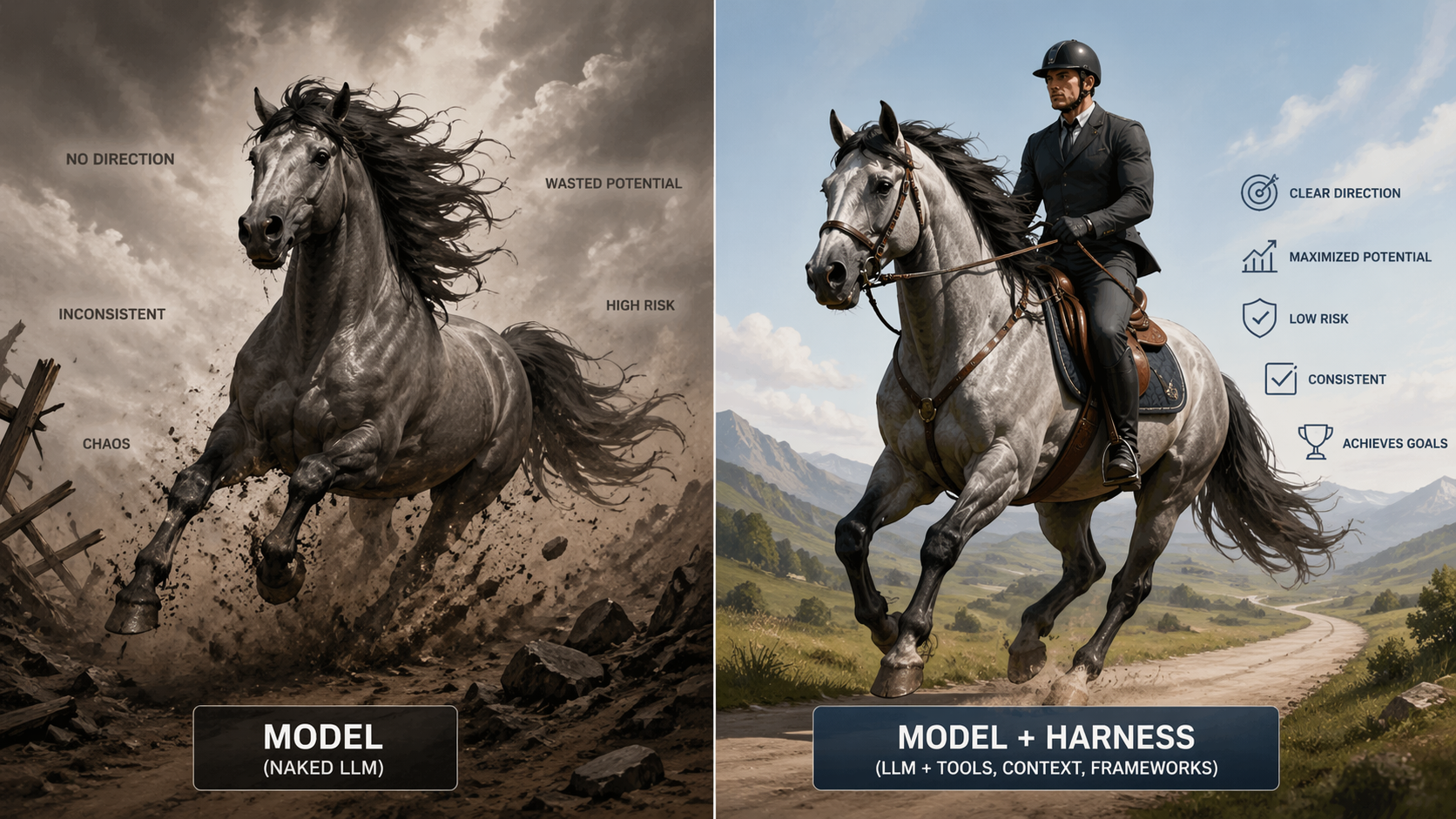 Harness这个词,英文原意是"马具"------缰绳、马鞍、笼头那一套东西。一匹千里马,你不给它套上马具,它只会四处乱跑。大语言模型就是这匹千里马。