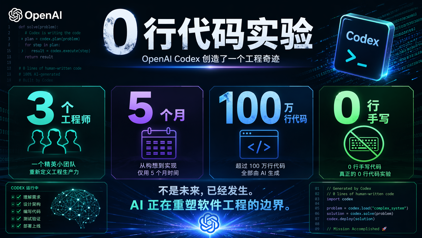 OpenAI在2026年2月11日发了篇官方博客,讲了一个疯狂的实验:三个工程师,五个月时间,用Codex从零构建了一个内部产品,大概写了100万行代码。重点是:人类没有手写一行代码。