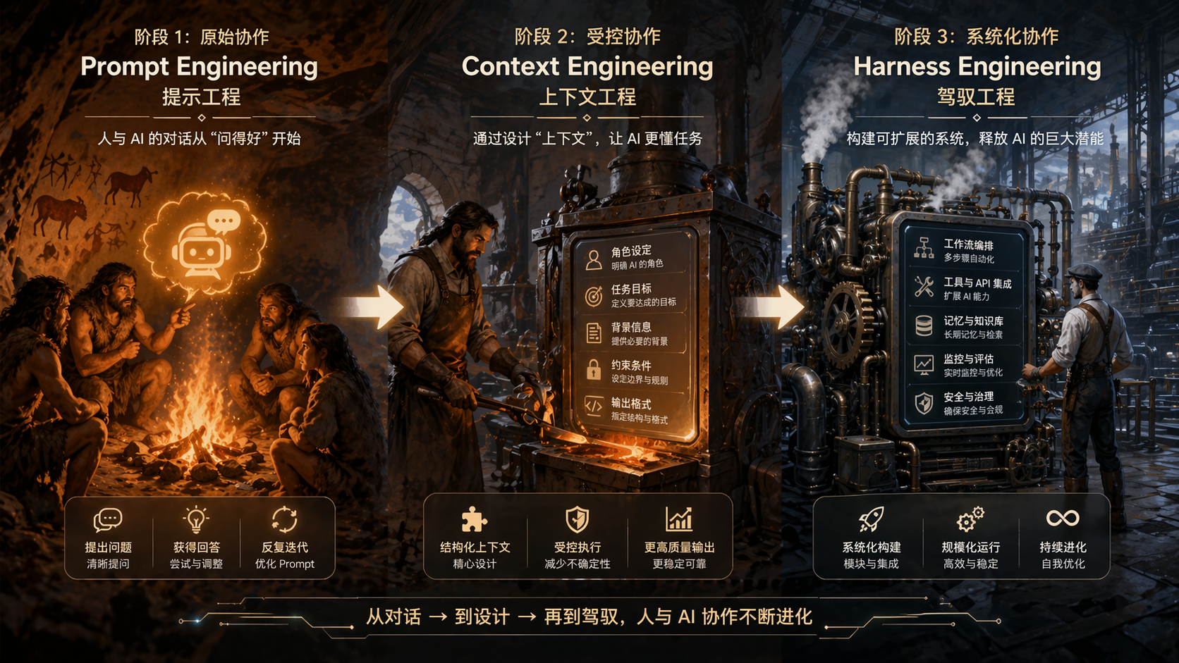 这个变化不是突然发生的。从Prompt Engineering到Context Engineering再到Harness Engineering,这不是谁替代了谁,而是一层一层的升维------就像人类从学会用火,到发明炉子控制火,再到用蒸汽机把火变成动力。