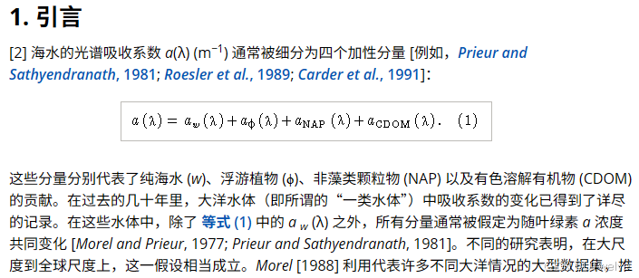 - a ( λ ) = a w ( λ ) + a ϕ ( λ ) + a N A P ( λ ) + a C D O M ( λ ) a(\lambda) = a_w(\lambda) + a_{\phi}(\lambda) + a_{NAP}(\lambda) + a_{CDOM}(\lambda) a(λ)=aw(λ)+aϕ(λ)+aNAP(λ)+aCDOM(λ)
