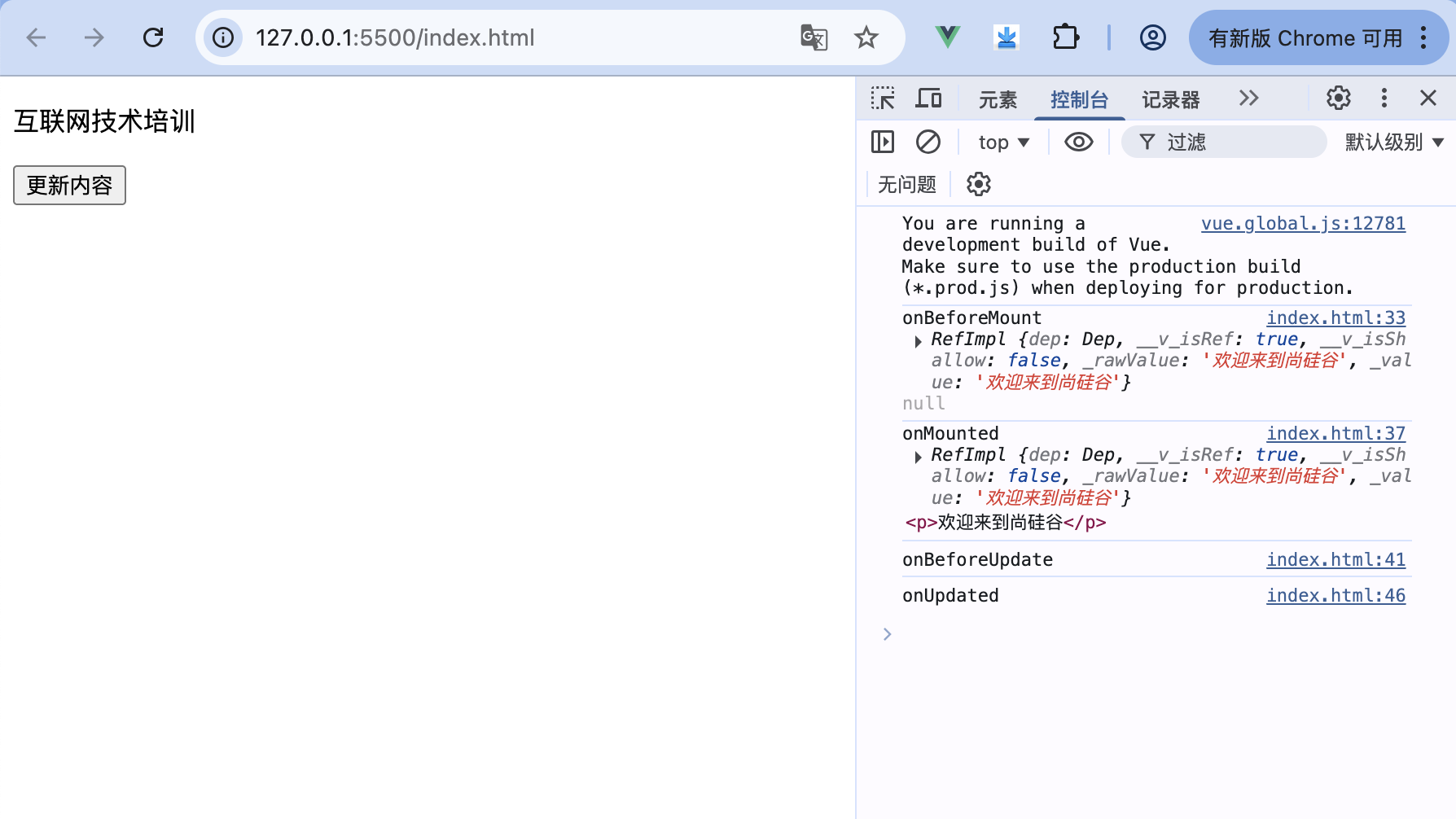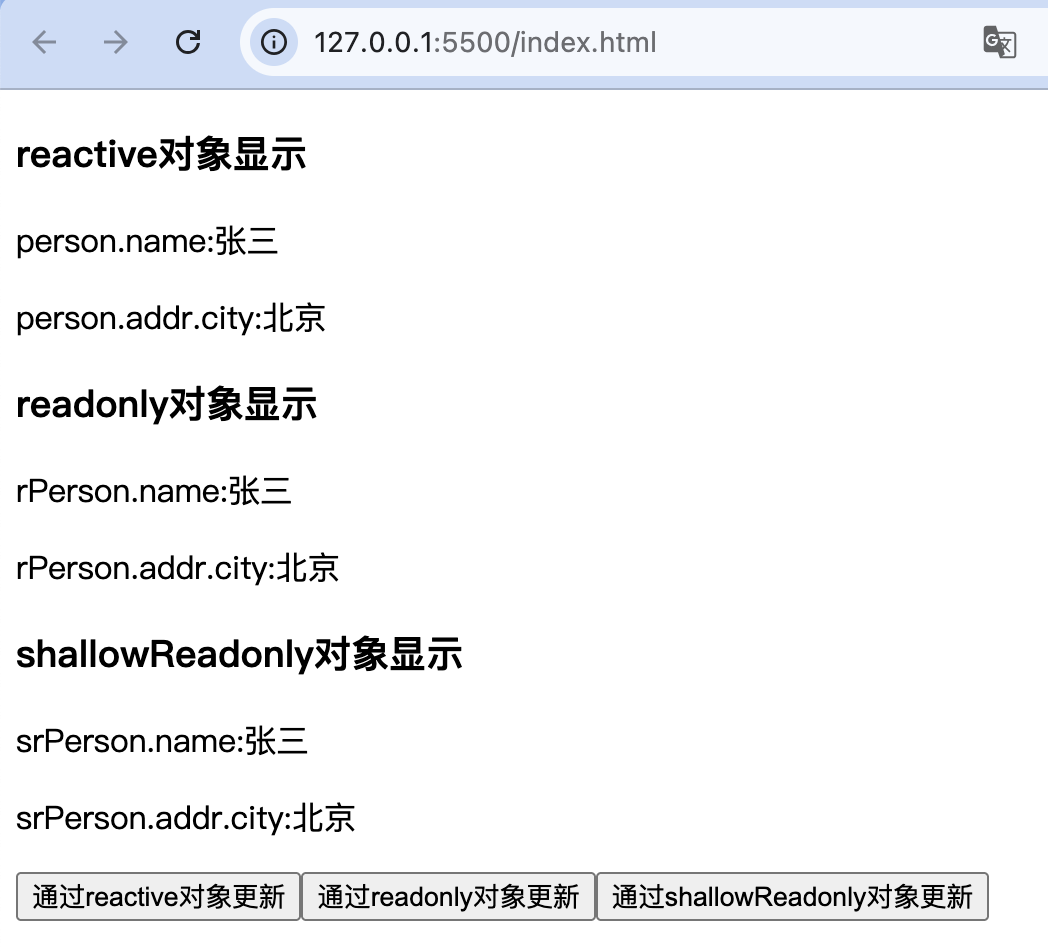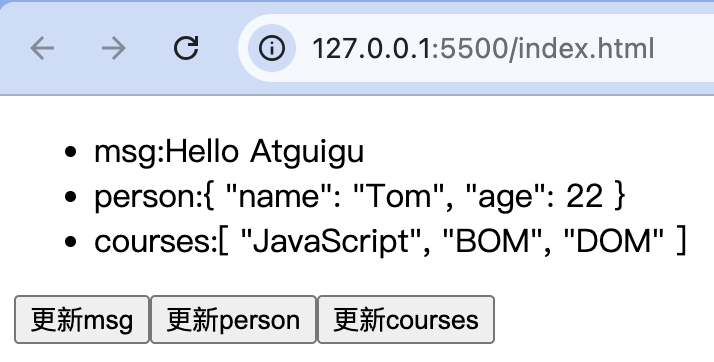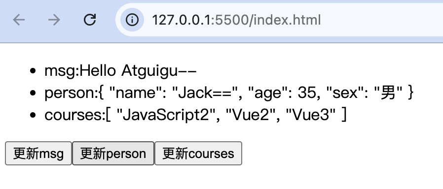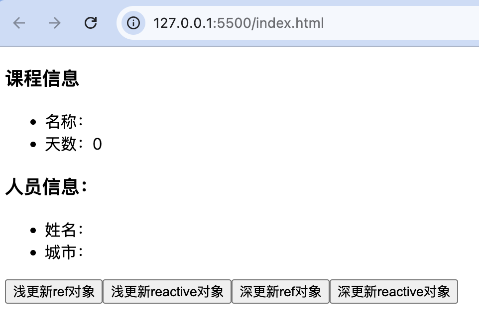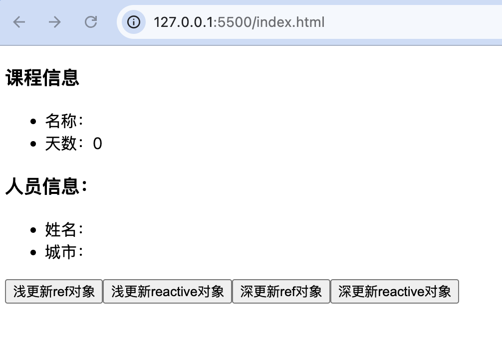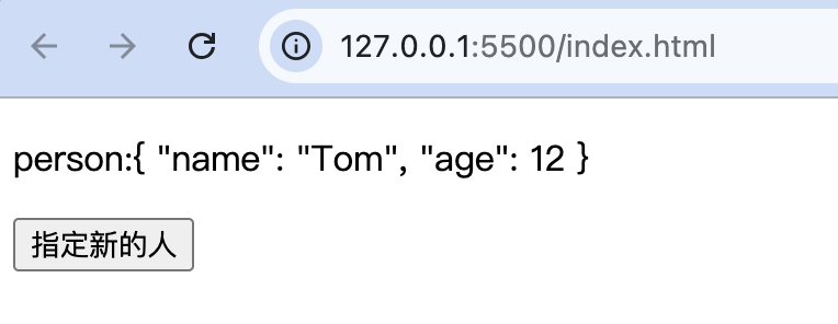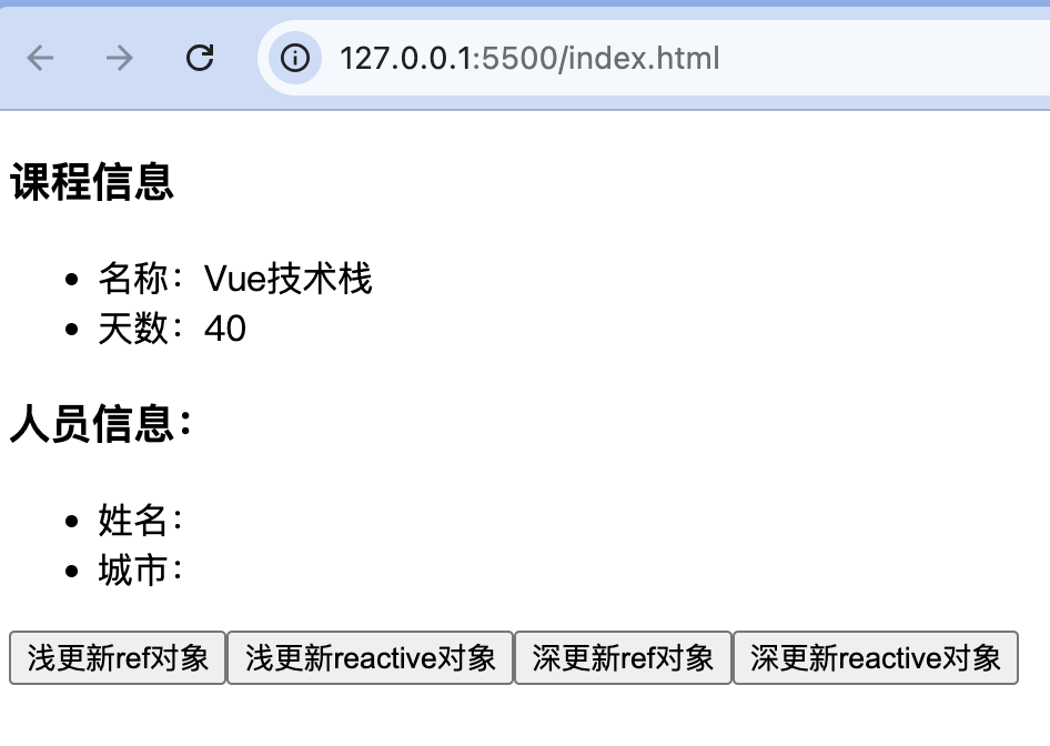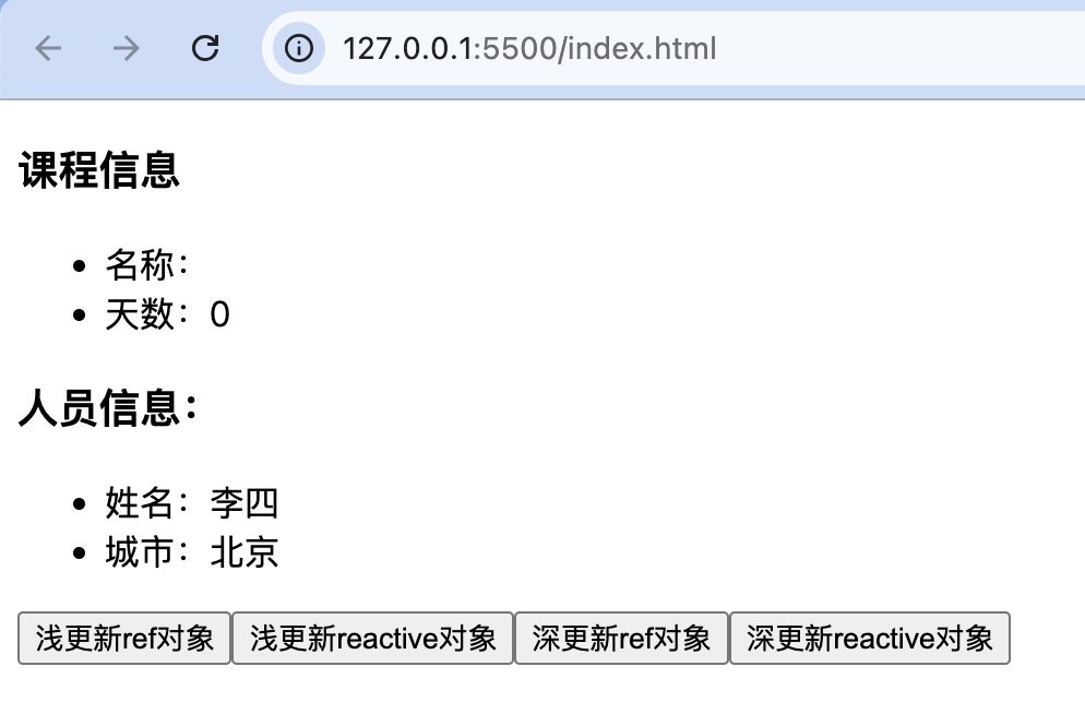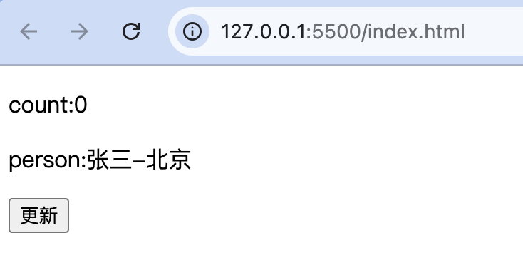 在上面的代码中,我们分别定义了一个ref对象countObj和一个reactive对象person,同时定义了一个准备更新数据的update函数,并通过return返回数据。在模板中读取了ref对象和reactive对象的数据并进行动态显示,将update函数绑定给按钮的点击监听。运行后的页面效果如图所示。